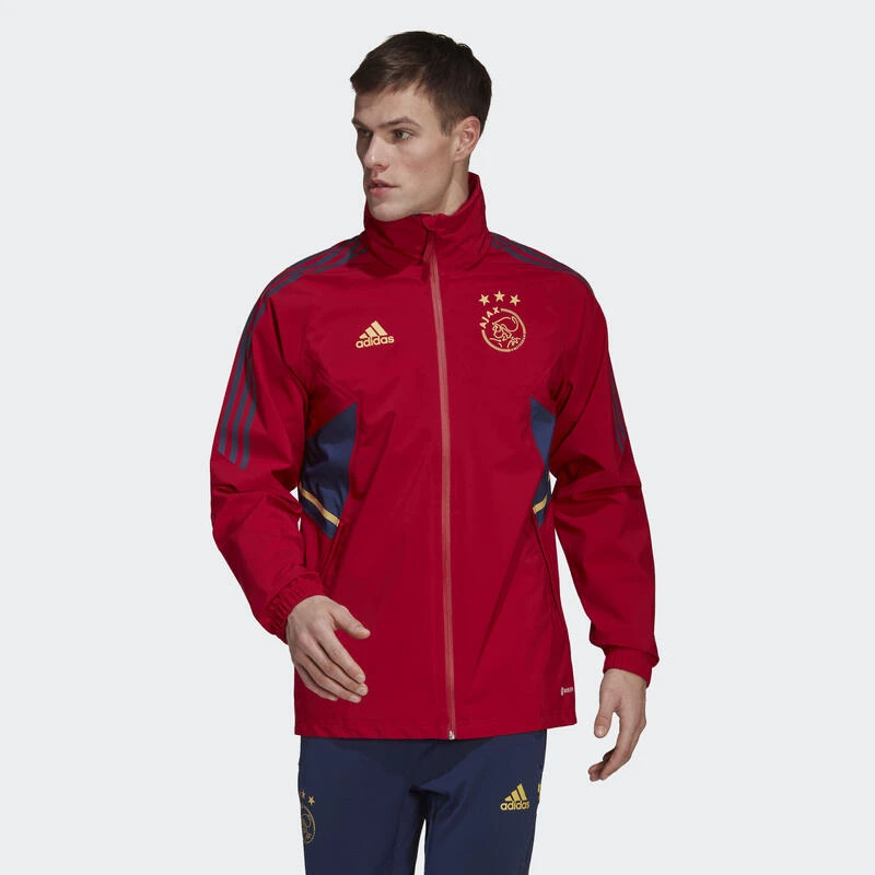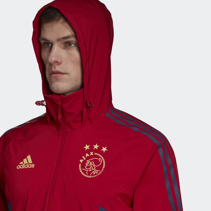 Als het begint te regenen tijdens de training, hoeft het voetballen niet op te houden. Dankzij RAIN.RDY houdt dit adidas Ajax Amsterdam jack moeiteloos nat en winderig weer bij je uit de buurt. Maak met de elastische koorden de capuchon op maat voor een nauwsluitende pasvorm, en als het opklaart, stop je ‘m weg in de kraag.Dit met 100% gerecyclede materialen gemaakte product vertegenwoordigt slechts één van onze oplossingen om plastic afval te verminderen.