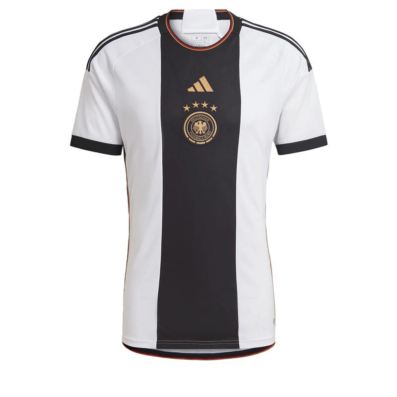 Een look die harten sneller laat kloppen Midden op de borst van dit adidas Duitsland voetbalshirt eist een geweven teamembleem met gouden details alle aandacht op. Anders dan bij andere moderne thuisshirts is de opvallende verticale streep opgevuld met nationaal elftal-DNA. Vlakken van mesh en vochtafvoerend AEROREADY werken samen om fans comfortabel te houden.