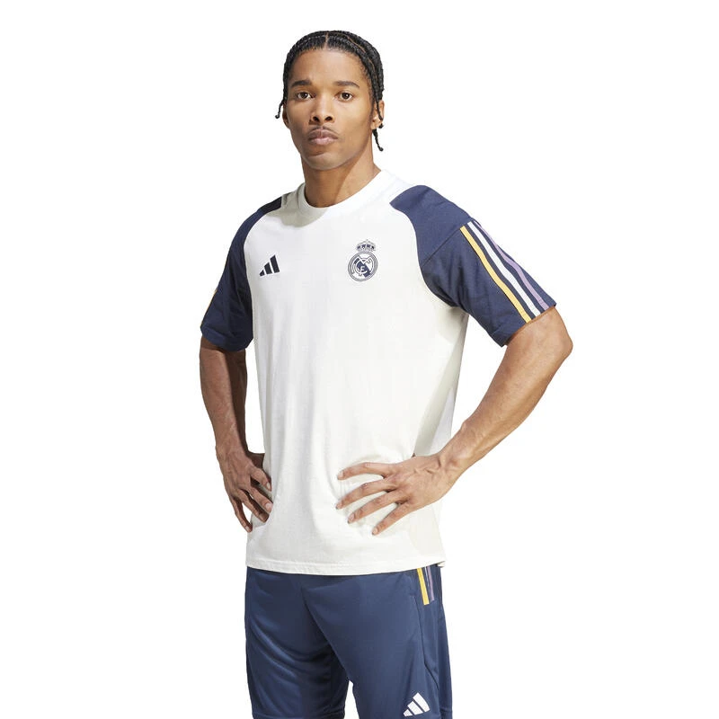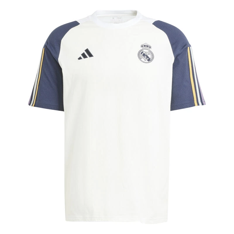 Vertegenwoordig je team van de bank tot op de tribune met dit Real Madrid katoenen t-shirt voor heren vanadidas. Dit regular-fit t-shirt in wit en navy is gemaakt van een zachte, lichtgewicht polyestermix met gerecycled katoen voor langdurig comfort. Het heeft een geribde ronde hals en korte mouwen voor een klassieke pasvorm, en is versierd metadidas ’s iconische 3 strepen op de mouwen en een Badge of sport logo op de borst. Getekend met het legendarische Real Madrid teamwapen. Machinewasbaar. nVerzorging en materiaaln65% katoen/35% gerecycled polyester